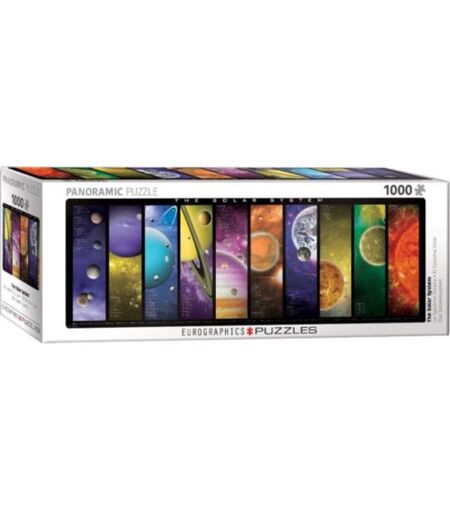 EuroGraphics Das Sonnensystem 1000-Teile Panorama Puzzle. Verpackungsabmessungen 35 x 13 x 9 cm. Abmessungen des zusammengebauten Puzzles 32 x 96 cm. Ein wunderschön illustriertes Panorama Puzzle mit 8 separaten Sektionen für jeden Planeten - plus Informationen zu Sonne und zu Zwergplaneten. Ein schönes Puzzle mit tollen Farben und lehrreichen Details. Speziell entwickelte Pappe mit wiederstandsfähiger Leinenstruktur für einen noch besseren Zusammenhalt der Teile. ...
