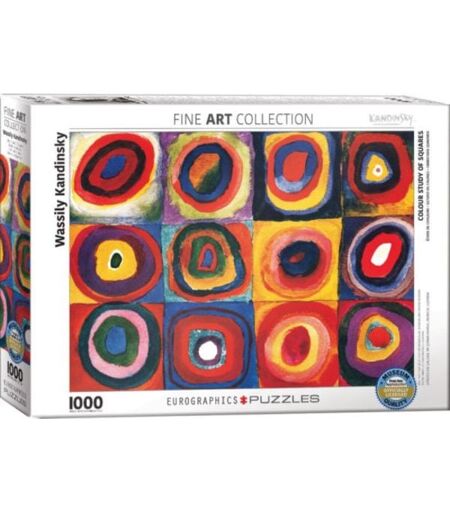 EuroGraphics Farbstudie Quadrate von Wassily Kandinsky 1000-Teile Puzzle. Verpackungsabmessungen 35 x 25 x 6 cm. Abmessungen des zusammengebauten Puzzles 48 x 68 cm. Kandinsky war ein Künstler des Expressionismus und einer der Wegbereiter der abstrakten Kunst. Er lebte in Frankreich und Deutschland und war Mitbegründer der Künstlervereinigung Der Blaue Reiter. Speziell entwickelte Pappe mit wiederstandsfähiger Leinenstruktur für einen noch besseren Zusammenhalt der Teile. ...
