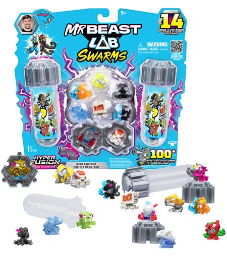 MrBeast Lab Swarms wurden „hyperfusioniert“, um die bisher wildesten Kreationen zu erschaffen. Sammle über 100 epische und einzigartige 2,5 cm große Hyper Fusion Swarms, inklusive dem Hyper Fusion Panther aus der Limited Edition. Jede Mega-Laborpackung enthält 14 Mini-Monster, darunter 1 exklusive Sonderedition und 1 ultraseltenes Mini-Monster, sowie 4 Fusions-Kapseln, die zusammengesteckt werden können, um deine Sammlung zu präsentieren und dein eigenes MrBeast Lab aufzubauen. Zudem sind 14 einzigartige Swarm-Sticker enthalten, die du in der Sammelanleitung einkleben kannst. Schaffst du es, alle Sticker zu sammeln und deine Sammlung zu vervollständigen? Was genau du erhältst? Eine Überraschung! ...
