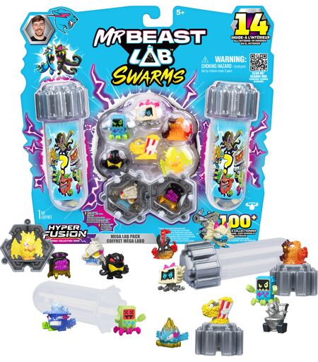 MrBeast Lab Swarms wurden „hyperfusioniert“, um die bisher wildesten Kreationen zu erschaffen. Sammle über 100 epische und einzigartige 2,5 cm große Hyper Fusion Swarms, inklusive dem Hyper Fusion Panther aus der Limited Edition. Jede Mega-Laborpackung enthält 14 Mini-Monster, darunter 1 exklusive Sonderedition und 1 ultraseltenes Mini-Monster, sowie 4 Fusions-Kapseln, die zusammengesteckt werden können, um deine Sammlung zu präsentieren und dein eigenes MrBeast Lab aufzubauen. Zudem sind 14 einzigartige Swarm-Sticker enthalten, die du in der Sammelanleitung einkleben kannst. Schaffst du es, alle Sticker zu sammeln und deine Sammlung zu vervollständigen? Was genau du erhältst? Eine Überraschung! ...