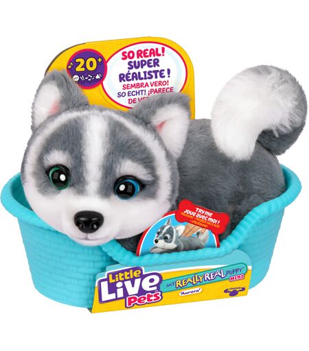 Der süße Husky-Puppy Aurora von Little Live Pets My Really Real Puppy Mini fühlt sich unglaublich echt an – er hat kuschelig-weiches Fell, unwiderstehlich niedliche Augen und reagiert mit über 20 Geräuschen und Reaktionen auf deine Berührungen! Bereit, deinen Puppy kennenzulernen? Streichle seinen Rücken und sieh zu, wie er zum Leben erwacht und niedliche Hundegeräusche von sich gibt. Schlafenszeit: Leg Aurora in ihr gemütliches Körbchen, damit sie sich erholen kann. Dann ist sie schon bald wieder bereit für neuen Spielspaß! Erlebe mit Little Live Pets My Really Real Puppy Mini, wie es ist, mit einem realistischen Welpen zu spielen. Einfach nur zum Verlieben! ...