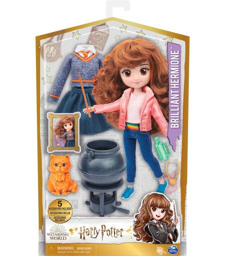 Mit der großartigen 20,3 cm großen Wizarding World Hermine kann man die Harry Potter-Lieblingsszenen nachstellen. Mit zwei verschiedenen Outfits und fünf Zubehörteilen ist die Brillante-Hermine-Puppe perfekt für das Geschichtenerzählen und unverzichtbar für die Fans von Harry Potter. Süße Gesichtsdesigns, weiches, extralanges lockiges Haar und fünf Artikulationspunkte erwecken die geliebte Harry Potter-Figur zum Leben. Brillante Hermine ist bereit für unendliche Zauberabenteuer, mit zwei verschiedenen Outfits. Anfänglich trägt sie ihren pinken Hoodie und Jeans, komplett mit Regenbogengürtel und abnehmbaren Sneakern, genauso wie man sie im Gefangenen von Askaban gesehen hat. Man kann Hermine auch ihre Hogwarts-Uniform mit dem Gryffindor-Pullover und dem Rock anziehen. Gibt man Hermine ihren Zauberstab in die Hand und platziert die Puppe, damit sie über dem Kessel Zaubertränke brauen kann, kann man sie imaginär in das Zaubertrankflaschen-Zubehör abfüllen. Hermine kann die Flasche wirklich halten. Legt man Hermine die Zeitumkehrer-Halskette um, kann man die ikonischen Filmszenen nachspielen. Außerdem kann Hermines reizendes Haustier, die Katze Krummbein, bei dem Spaß mitmachen. Diese 20,3 cm Brillante Hermine-Puppe beflügelt die eigene Fantasie dank des spaßigen und aufregenden imaginären Spiels. Fügt man der eigenen Sammlung alle anderen 20,3cm großen Harry Potter-Puppen hinzu, lässt sich die eigene Wizarding World noch weiter ausbauen. Diese 20,3 cm Brillante Hermine-Puppe und die 20, cm Harry Potter-Puppen sind großartige Geschenke für Mädchen. Eintauchen in die Zauberwelt von Harry Potter, mit der 20,3 cm großen Brillante Hermine-Puppe. ...