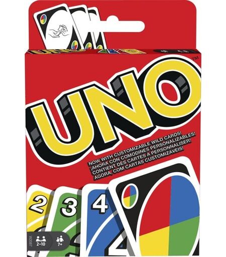 Wer einmal anfängt, hört nie wieder auf! Bei dieser Neuauflage des klassischen UNO-Spiels sorgen individuelle Karten für den ganz besonderen Dreh. Die Spieler legen abwechselnd passende Handkarten auf dem Kartenstapel ab und versuchen, möglichst als Erster alle Karten loszuwerden. Spezielle Aktionskarten bringen immer wieder neue Wendungen und lassen die Mitspieler alt aussehen. Legt ein Spieler die Handtauschkarte ab, kann er seine Karten mit einem beliebigen Mitspieler tauschen. Und auf die drei individuellen (und löschbaren) Joker-Karten kann man seine eigenen Hausregeln schreiben. Es gibt jeweils 19 Karten in den Farben Rot, Grün, Blau und Gelb, 8 „Zieh 2“-; Retour- und Aussetzen-Karten in den jeweiligen Farben, 4 Farbenwahl-Karten, 4 „Zieh 4“-Farbenwahlkarten; 1 Handtauschkarte und 3 individuelle Karten. Hat ein Spieler keine passende Karte, muss er eine vom Kartenstock ziehen. Aber nicht vergessen „UNO“ zu rufen, wenn man nur noch eine Karte auf der Hand hat. Der Spieler, der als Erster alle seine Karten abgelegt hat, erhält Punkte für die Karten, die seine Mitspieler noch auf der Hand halten. Gewonnen hat der Spieler, der als Erster 500 Punkte hat. 112 Karten und Spielregeln inkl. ...