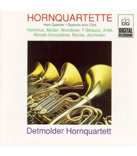 Brand : MDG, Binding : Audio CD, Label : Mdg (New Arts International), Publisher : Mdg (New Arts International), NumberOfDiscs : 1, PackageQuantity : 1, medium : Audio CD, releaseDate : 1999-02-01, artists : Detmolder Hornquartett, composers : Homilus, Molter, Wunderer, Franz Strauss ...
