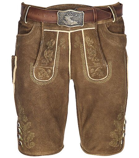 Modell: Vitus Farbbezeichnung: Braun Herren Lederhose aus Hirschleder Kurzes Bein mit vier Knöpfen am Beinabschluss Stickereien Geknöpfter Latz Zwei Taschen an der Vorderseite Eine Gesäßtasche Seitliche Messertasche Bundweite durch rückseitiges Lederband individuell verstellbar Hochwertige Ausführung Material: 100% Hirschleder Pflegetipp: Lederspezialreinigung ...