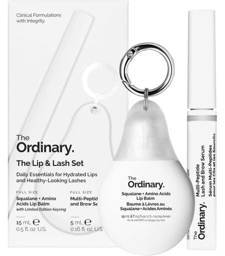 The Ordinary's Lip & Lash Set features a duo of full-size formulations designed to enhance your daily routine. This targeted edit works to promote hydrated, nourished lips, alongside the appearance of fuller, healthier-looking lashes and brows. Set Contents: Multi-Peptide Lash & Brow Serum 5ml A lightweight, non-greasy serum that supports the look of thicker and fuller lashes and brows. The concentrated formula features 11 active ingredients, including four peptide complexes and a series of natural extracts, to nourish and protect your hair. Squalane + Amino Acids Lip Balm 15ml A multi-use balm that provides lasting hydration to the lips. Formulated with squalane and amino acids, the moisturising balm helps to soften the lips and support the skin's natural moisture barrier. The set includes a complimentary keychain for on-the-go application. ...