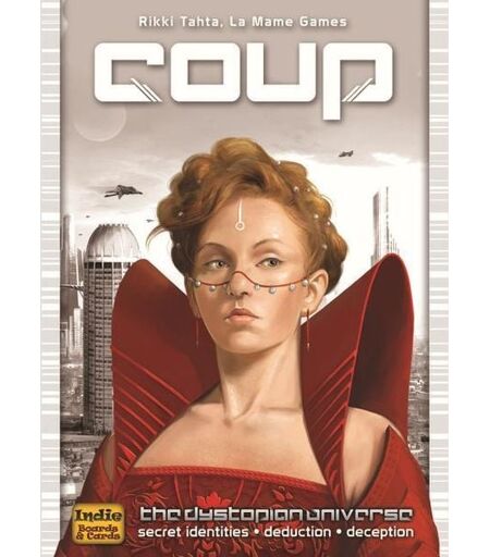 You are head of a family in an Italian city-state, a city run by a weak and corrupt court. You need to manipulate, bluff and bribe your way to power. Your object is to destroy the influence of all the other families, forcing them into exile. Only one family will surviveIn Coup, you want to be the last player with influence in the game, with influence being represented by face-down character cards in your playing area.Each player starts the game with two coins and two influence i.e., two face-down character cards; the fifteen card deck consists of three copies of five different characters, each with a unique set of powers:- Duke: Take three coins from the treasury. Block someone from taking foreign aid.- Assassin: Pay three coins and try to assassinate another players character.- Contessa: Block an assassination attempt.- Captain: Take two coins from another player, or block someone from stealing coins from you.- Ambassador: Draw two character cards from the Court (the deck), choose which (if any) to exchange with your face-down characters, then return two. Block someone from stealing coins from you.On your turn, you can take any of the actions listed above, regardless of which characters you actually have in front of you, or you can take one of three other actions:- Income: Take one coin from the treasury.- Foreign aid: Take two coins from the treasury.- Coup: Pay seven coins and launch a coup against an opponent, forcing that player to lose an influence. (If you have ten coins, you must take this action.)When you take one of the character actions whether actively on your turn, or defensively in response to someone elses action that characters action automatically succeeds unless an opponent challenges you. In this case, if you cant reveal the appropriate character, you lose an influence, turning one of your characters face-up. Face-up characters cannot be used, and if both of your characters are face-up, youre out of the game.If you do have the character in question, you reveal it, the opponent loses an influence, then you shuffle that character into the deck and draw a new one, perhaps getting the same character again and perhaps not.The last player to still have influence that is, a face-down character wins the game!A new & optional character called the Inquisitor has been added. The Inquisitor character cards may be used to replace the Ambassador cards.- Inquisitor: Draw one character card from the deck and choose whether or not to exchange it with one of your face-down characters. OR Force an opponent to show you one of their character cards (their choice which). If you wish it, you may force them to shuffle the card into the deck. They then get to draw a new card. Block someone from stealing coins from you. ...