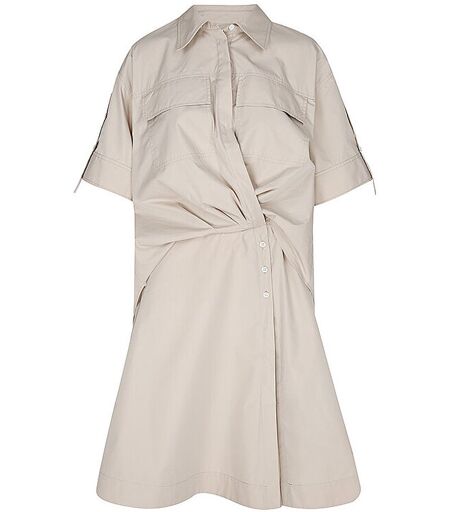 Modisches Damen Midikleid aus angenehmem Baumwoll-Mix Hemdblusenkragen Schließt mit verdeckter Knopfleiste in der vorderen Mitte Kurzarm Weite Ärmel mit Manschette und Knopfverschluss Zwei aufgesetzte Brusttaschen mit Patte  Seitliche Eingrifftasche Elastisch in der Taille Drapierung im Vorderteil Unterknielänge Länge: Ca. 100 cm Unifarben Farbbezeichnung: Khaki Material: 70% Baumwolle, 30% Polyester ...