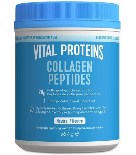 Anwendungsgebiet von Vital Proteins Collagen PeptidesVital Proteins Collagen Peptides - Unser geschmacksneutrales Kollagenpulver ist die perfekte Ergänzung für deine tägliche Wellness-Routine. Die reinen Kollagen-Peptide lassen sich problemlos in kalte oder warme Flüssigkeiten einrühren und sind dabei völlig geschmacksneutral. Ob im Kaffee, Smoothie oder Tee – Sie entscheiden.Unser hydrolysiertes Kollagenpulver mit Kollagen Typ I und III versorgt deinen Körper mit wichtigen Bausteinen für rundum schöne Haut, Haare und Nägel.Durch die hohe Bioverfügbarkeit werden die Kollagen-Peptide optimal vom Körper aufgenommen. Unser Kollagen ist zudem Paleo-freundlich und glutenfrei, perfekt für eine ausgewogene Ernährung.Warum ist Kollagen so wichtig?Kollagen ist das im Körper am häufigsten vorkommende Protein und macht 30% aller Proteine im Körper aus. Kollagen unterstützt die Struktur unseres Haars, unserer Haut, Nägel, Knochen, Bänder und Sehnen - und sorgt dafür, dass unser Haar glänzt und unsere Haut strahlt. Zudem haben Proteine im Körper vielfältige und wichtige Aufgaben und sind für ihre Fähigkeit bekannt, zur Erhaltung von Muskelmasse und normaler Knochen beizutragen.Mit zunehmendem Alter nimmt jedoch auch die körpereigene Kollagenproduktion ab. Ab etwa dem 25. Lebensjahr produziert unser Körper jedes Jahr weniger Kollagen. Nehmen Sie sich also die Zeit für deine Wellness- & Beauty-Routine und tun Sie sich etwas Gutes.Wirkstoffe / Inhaltsstoffe / ZutatenZutaten von Vital Proteins Collagen Peptides: