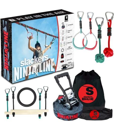 Die beliebte Slackers Ninja Line im neuen Design und mit einem neuen Obstacle! 11m lange Ninja-Line (nutzbare Länge ca. 9m), 5cm breit, mit vernähter Schlaufe. Massive Metallratsche mit Kunststoffgriff und vernähter Schlaufe, inkl. Tragetasche. 14 vernähte Ösen in der Line, um die mitgelieferten Hindernisse unverrutschbar mit den Delta-Sicherheitskarabinern aus Metall zu befestigen. Mit im Set sind außerdem 2 Gymnastik Ringe, 2 Affenschaukeln, 2 Affenfäuste und 1 Traversenring; diese dienen als Hindernisse zum Hangeln und können individuell angebracht werden. Die Ninja-Line kann außerdem als Slackline verwendet werden. Lieferung im 4c Karton inkl. Aufbewahrungstasche, Beschreibung und Anleitung. Maximale Belastbarkeit: 113kg. Gesamtlänge der Ninja Line = 11 m. Das Festende mit Ratsche = 1,80 m. Das Losende = 9,20 m mit 14 Schlaufen zur Befestigung diverser Obstacles. Der Mindestabstand zwischen beiden Anschlagpunkten (Bäumen) sollte mindestens 5,50m betragen, damit alle Obstacles genutzt werden können. ...