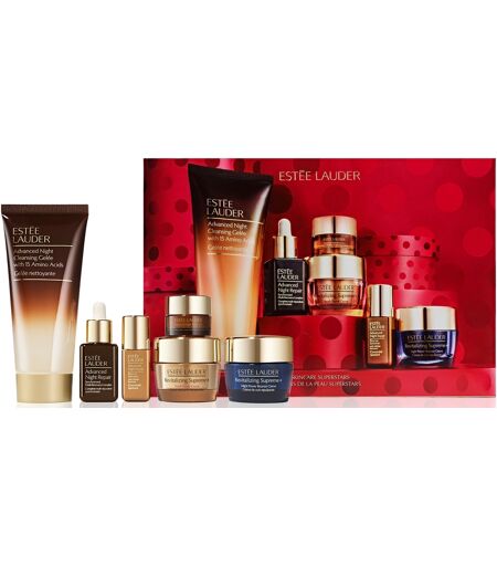 The Estée Lauder Glow Effect Set features a collection of high-performance formulas for stronger, radiant, healthier-looking skin. This curated edit provides everything you need to support your complexion, promoting a luminous and smooth appearance with a complete nighttime routine. Set Contents: Advanced Night Cleansing Gelée 100ml A gentle gel cleanser that transforms into a soft foam, thoroughly removing makeup and impurities without disturbing the skin's moisture barrier. Advanced Night Repair Rescue Solution 5ml Formulated with 15% bifidus ferment, this potent solution helps to calm the skin and reduce the look of redness, leaving the complexion feeling hydrated and supple. Advanced Night Repair Synchronized Multi-Recovery Complex 15ml Powered by an exclusive night peptide, this fast-absorbing serum promotes a smoother, more radiant and even-toned appearance. Advanced Night Repair Eye Supercharged Gel-Creme 5ml This gel-creme helps to brighten the look of the under-eye area, diminishing the appearance of dark circles, lines and puffiness. Revitalizing Supreme+ Youth Power Creme 15ml A multi-action moisturiser that works to improve the skin’s firmness and elasticity, encouraging a more lifted and sculpted look. ...