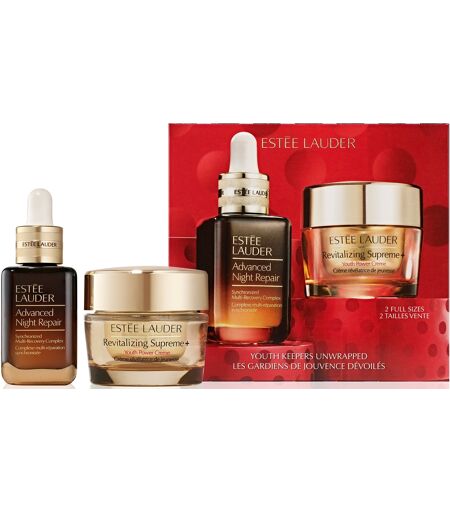The Estée Lauder Advanced Night Repair + Supreme Skincare Gift Set features two full-size formulas designed to support the skin’s overnight cycle. This high-performance duo works in harmony to promote a smoother, more radiant-looking complexion, while visibly improving the skin’s firmness and elasticity. Awaken to skin that appears revitalised and refreshed. Set Contents: Advanced Night Repair Synchronized Multi-Recovery Complex 30ml A fast-absorbing serum that works to enhance the skin’s natural rhythm. Powered by the brand's exclusive night peptide, the formula helps to diminish the look of fine lines, promoting a smoother and more even-toned complexion with a luminous finish. Revitalizing Supreme+ Youth Power Creme 30ml This multi-action moisturiser envelops the skin in a rich, nourishing texture. The cream works to visibly improve firmness and density, leaving the skin with a stronger feel and a more lifted appearance. Skin appears radiant and full of vitality. ...