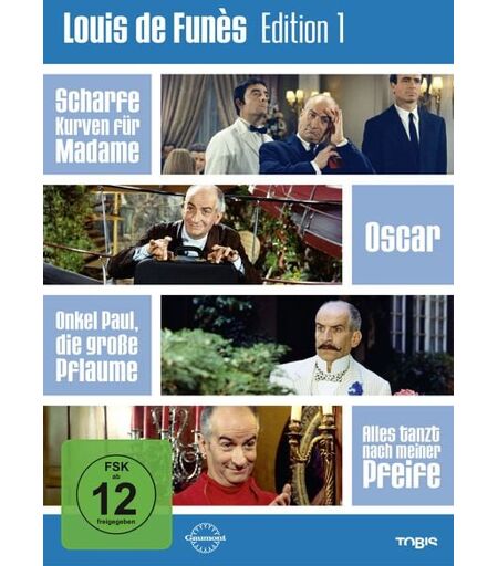 """Scharfe Kurven für Madame"" (1966, ca. 84 Min.) Louis de Funès als wunderbar cholerischer Herrscher über einen Pariser Schlemmertempel.Septime ist der Besitzer eines Pariser Restaurants bester Klasse. Hin und wieder überprüft er die Qualität seiner Gerichte auch selbst, indem er, verkleidet und als Gast getarnt, in seinem eigenen Restaurant speist - und wehe, es ist nicht alles nach seinem Geschmack! Und so soll auch der südamerikanische Präsident Novales genau hier die Vorzüge der französischen Küche kennen lernen. Septime gibt sich größte Mühe, den wichtigen Gast zufrieden zu stellen. Doch gerade als er seine ""Bombe surprise"" servieren will, passiert es. Als Septime das Licht löscht, um seine Spezialität zu servieren, gibt es einen lauten Knall und der Staatsmann ist verschwunden. Septime ist in größter Sorge, weil so etwas ausgerechnet on seinem Lokal passieren musste. Für die Polizei ist der Besitzer höchst verdächtig. Nun ist der cholerische Septime nicht mehr zu halten, die Gangster im Alleingang zu erledigen. ""Oscar"" (1967, ca. 80 Min.) Turbulentes Gag-Feuerwerk mit dem grandiosen Louis de Funès.Bertrand Barnier ist ein reicher Geschäftsmann, der sein Leben liebevoll zwischen seiner Frau und seiner Tochter Colette aufteilt. Um in Form zu bleiben, trainiert er regelmäßig mit einer jungen Sportlerin, die wohl mehr Muskeln als Verstand hat. Der Haushalt macht sich sozusagen ""von alleine"", dank des Dienstmädchens Bernadette, des Chauffeurs Oscar und einem Butler. Aber diese äußerst bequeme Situation ist geradezu dazu bestimmt, durcheinander gebracht zu werden. Und es ist sein Geschäftspartner und Vertrauter, Christian Martin, der die Katastrophe ins Rollen bringt. Eines Morgens platzt er in Barniers Schlafzimmer und offenbart ihm, dass er eine Verdoppelung seines Gehalts fordert, dass er vor hat, Barniers Tochter zu heiraten, und dass er sowieso ein reicher Mann sei, weil er Barnier jahrelang bestohlen hat! Falls sein Wille nicht geschehen würde, müsse er alle Steuersünden seines Chefs enthüllen… ""Onkel Paul, die große Pflaume"" (1969, ca. 79 Min) Ein aufgetauter Großvater treibt Louis de Funès an den Rand des Wahnsinns!Das beschauliche und vor allem ruhige Leben von Fabrikant Paul de Tartas und seiner Familie wird komplett auf den Kopf gestellt, als der Großvater Paul Fournier völlig unerwartet zurückkehrt. 65 Jahre nachdem sein Schiff gegen einen Eisberg schlug, wurde der Körper Fourniers konserviert in einem Eis-Block entdeckt und zurück ins Leben geholt. Fourniers Problem: Er glaubt, er sei 25 und lebe zu Anfang des Jahrhunderts. Nun ist es die dankbare Aufgabe der Familie, ihn langsam an die neue Welt zu gewöhnen. Sie dekoriert ihr Haus um und kleidet sich im Stile der Jahrhundertwende, um ihn glauben zu lassen, er lebe noch immer zu Zeiten seines 25. Geburtstags. Das ruhige Leben der Tartas ist nun endgültig vorbei und schon nach kurzer Zeit muss die Familie feststellen, dass sich Fournier keineswegs wie ein Opa benimmt…... ...