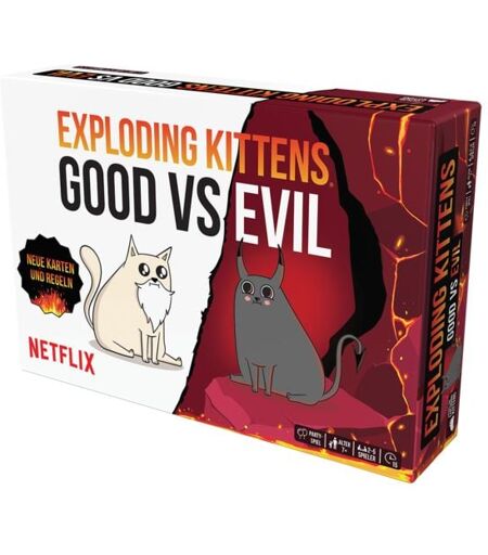 Die eigenständige Version Exploding Kittens: Good vs. Evil zur gleichnamigen Netflix-Animationsserie nimmt die Spieler mit in den ultimativen Wettstreit zwischen Gut und Böse – und explodierenden Kätzchen. Für eine Chance auf die mächtigste Karte im Spiel lösen die Kontrahenten das Armageddon aus und tragen mithilfe der beiliegenden Spielmatte einen Kampf per Minispiel im Spiel aus. Nur einer kann siegreich aus diesem Showdown hervorgehen und sich die allmächtige Gotteskatze sichern, während der andere der durchtriebenen Satanskatze zum Opfer fällt. Hier nimmt der ewige Konflikt zwischen Gut und Böse wahrlich epische Ausmaße an – in den Körpern pummelig-gemütlicher Hauskatzen. ...