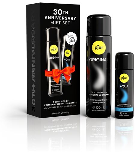 Das exklusive 30th Anniversary Geschenkset von pjur enthält 1 x pjur ORIGINAL (100 ml) sowie 1 x pjur AQUA (30 ml) gratis dazu. 2 Gleitgele zum Preis von einem! pjur ORIGINAL ist eines der beliebtesten silikonbasierten Gleitmittel für herrliche Haut-an-Haut-Kontakte – beim Sex und bei der Massage! Mit außergewöhnlich langanhaltender Gleitfähigkeit ohne Klebeeffekt. Es hinterlässt auf der Haut ein herrlich seidiges Gefühl. pjur AQUA ist die wasserbasierte Gleitgel-Variante. Es spendet der Haut viel Feuchtigkeit und pflegt diese dadurch besonders sanft und nachhaltig. Für ein samtig-geschmeidiges Gefühl besonders bei trockener und beanspruchter Haut. Auch beim Spielen mit Toys. Beide pjur Premium-Gleitgele überzeugen mit exzellenten Gleiteigenschaften ohne zu kleben. Sie sind äußerst ergiebig, nur wenige Tropfen genügen für eine Anwendung. Rezepturen ohne zusätzliche Geruchs- und Geschmacksstoffe. Zur Verwendung mit Latexkondomen geeignet. Limited Edition – schnell zugreifen! ...
