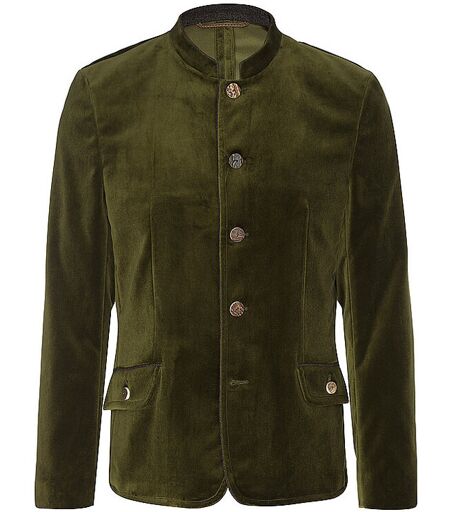 Herren Trachtensakko aus Samt Stehkragen Schließt mit Knopfleiste Langarm Pattentaschen mit Knopf Gerade Passform Unifarben Farbbezeichnung: Oliv Material: 73% Baumwolle, 27% Modal Futter: 94% Polyester, 6% Elasthan ...