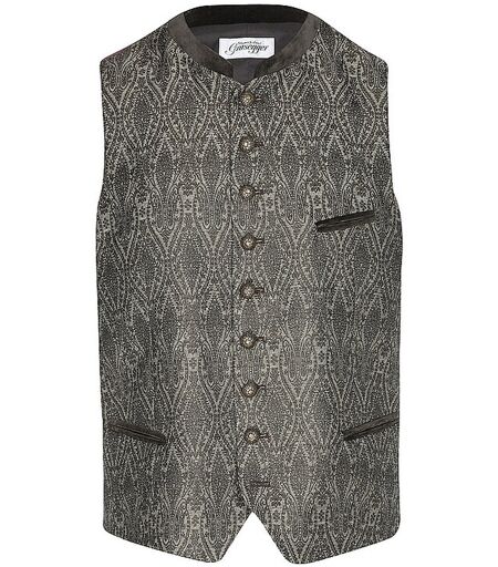 Herren Trachtengilet aus Baumwoll-Mischung Stehkragen Schließt mit Schmuckknöpfen Ohne Arm Paspelierte Eingrifftaschen Innentaschen Verstellbarer Rückenriegel Rückseite aus gestreiftem Kontraststoff Ornamentales Muster Gerade Passform Farbbezeichnung: Oliv Gemustert Material: 50% Polyester, 25% Polyacryl, 25% Baumwolle Material Rückenteil: 100% Baumwolle Futter: 96% Baumwolle, 4% Elasthan ...