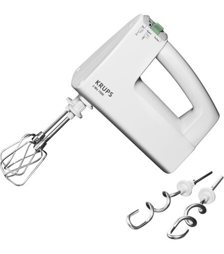 Noch nie war Mixen so einfach: Mit dem KRUPS 3MIX 7000 Handmixer stellt man im Handumdrehen perfekten Back- oder Rührteig, Eischnee und Schlagsahne her. Dieses einfach zu bedienende Küchengerät ist mit Quirlen aus Edelstahl ausgestattet und sorgt dafür, dass man perfekten Eischnee für köstliche Baiser, Mousse, Soufflé, Schlagsahne und vieles mehr zaubern können. Die dicken Edelstahl-Knethaken sorgen dabei für ein perfektes Ergebnis für alle Teigarten, zur einfachen Zubereitung von leckerem Brot-, Pizzateig oder Hefegebäck. Dieser perfekte Handmixer wird durch den ergonomischen Griff, der für optimalen Halt und Bedienkomfort sorgt, und durch die stufenlose Geschwindigkeitsregulierung und die Turbostufe für eine perfekte Steuerung abgerundet. ...