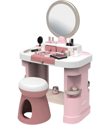 Der My Beauty Schminktisch von Smoby ist die ideale Grundlage für fantasievolle Rollenspiele kleiner Beauty-Fans. My Beauty Schminktisch von Smoby inkl. passendem Hocker und 15 Accessoires (unechte Kosmetika (2 Lippenstifte mit mechanischer Funktion, 2 Nagellacke, Wimperntusche, Lidschatten-Palette), Kamm, Bürste, 3 Dosen, 2 Fläschchen, ein Ring und ein Haarreif) mit kippbarem Spiegel, Schubladen, Ablagen und Regalen 32(L) x 54(B) x 85(H) cm, Hockerhöhe 27 cm aus Kunststoff (60 % Recyclinganteil) ab 3 Jahren geeignet hergestellt in Frankreich Mit dem My Beauty Schminktisch von Smoby haben Kids ab drei Jahren jede Menge Spaß. Die Minis können auf dem Hocker Platz nehmen und im Spiel verschiedene Make-ups, Frisurenstylings und Nagedesigns ausprobieren. Die 15 verschiedenen Accessoires bieten ihnen ein möglichst realistisches Erlebnis. Sie lassen sich in den verschiedenen Schubladen, Ablagen und Regalen des Schminktischs verstauen. In dem kippbaren Spiegel können die Nachwuchs-Hairstylistinnen und -Visagisten anschließend ihre Ergebnisse bestaunen. Gut zu wissen: Der Schminktisch wird in Frankreich produziert. Für nachhaltige Eigenschaften setzt er auf einen Recyclinganteil von 60 Prozent. ...