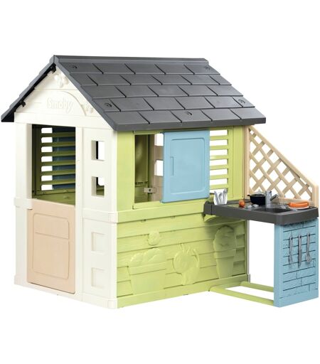 Das stabile Smoby Life Spielhaus Pretty bietet mit seiner tollen Sommerküche viel Spielspaß für die Kleinen. Das Beste: Das Spielhaus ist aus 55% Recycling-Kunststoff hergestellt. Spielhaus Pretty von Smoby aus der Smoby Life-Kollektion mit Sommerküche 2 Gläser, 2 Teller, 2 Würstchen, Topf, Besteck und Küchenutensilien 145(L) x 110(B) x 127(H) cm mit 55% Recycling-Kunststoff ab 2 Jahren geeignet hergestellt in Frankreich Die an der Außenwand befestigte Spielküche verfügt über eine Spüle mit Wasserhahn, eine Barbecue-Grillplatte zum Kochen und Grillen sowie eine Geschirrablage. Vervollständigt wird das Koch-Erlebnis durch zwei Gläser, zwei Teller, verschiedene Küchenhelfer, Würstchen und einen kleinen Topf. Im Inneren bietet das Spielhaus viel Platz zum Spielen und Verstecken. Dank des besonderen Fertigungsverfahrens ist es kinderleicht zu montieren und besonders stabil. Die angesagte Farbgestaltung gibt dem Gartenhäuschen ein frisches und modernes Äußeres. Die vier robusten Seitenwände sind detailreich gestaltet. Schmetterlinge und eine kleine Katze zieren die Fassade und sorgen für ein lustiges Design. Zwei Fenster mit Lamellen, zwei Schiebefenster zum Auf- und Zuschieben sowie eine kleine Eingangstür ergänzen die Ausstattung des Hauses. Das Spielhaus kombiniert auf geschickte Weise recyceltes Material und hochwertiges neues Kunststoffgranulat. Oberstes Ziel ist die Sicherheit der kleinen Abenteurer; eine sorgfältige Material-Mischung sorgt für die perfekte Balance zwischen Langlebigkeit, Stabilität und Nachhaltigkeit. Das vielseitige Kinder-Spielhäuschen kann mit den Smoby Spielhaus-Zubehörsets erweitert werden. ...