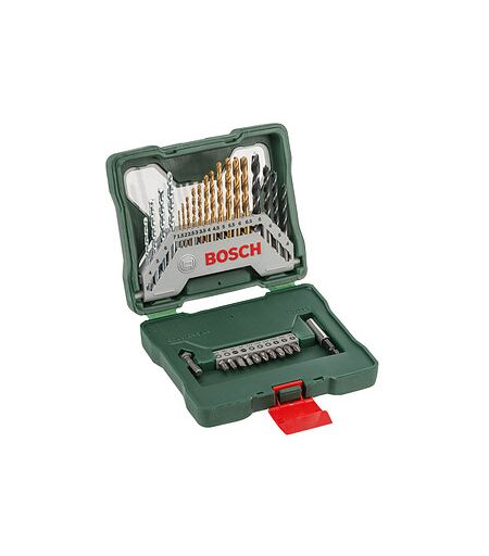 Perfekte Präzision für vielseitige Bohraufgaben!Das TiN-beschichtete Bit-Set X-Line von BOSCH ist ein unverzichtbarer Begleiter für alle Handwerksprofis. Die umfangreichen Bits und Bohrer bietet eine unschlagbare Kombination aus Robustheit und Präzision.Zuverlässige Bohrkraft für jede OberflächeDas 30-teilige Set ist perfekt auf die Bedürfnisse von Profis zugeschnitten und für alle Elektrowerkzeugmarken geeignet. Egal, ob Holz, Metall oder Stein – dieses Set meistert jede Herausforderung mit Leichtigkeit.Im Set enthalten sind:11 Metallbohrer, Ø 1,5–6,5 mm, mit Titannitridbeschichtung, die durch schnellen Bohrfortschritt und besonders lange Lebensdauer überzeugen (nicht für die Verwendung in Aluminium geeignet).10 Extra Hard Schrauberbits für die Verwendung mit den gängigsten Schrauben (Phillips, Pozidriv, Torx und Schlitz).1 Universalmagnethalter mit Senker4 robuste Steinbohrer mit Karbide-Spitze, Ø 4–7 mm, die durch lange Lebensdauer, schnellen Materialabtrag, niedrige Wärmeentwicklung und Präzision auszeichnen.4 scharfe Holzbohrer, Ø 4–8 mm, mit Zentrierspitze und Eckfräser für präzises, ausrissfreies Bohren von LöchernPerfektionieren Sie Ihre Bohraufgaben und setzen Sie auf ein zuverlässiges Werkzeug, das höchsten Ansprüchen gerecht wird. Bestellen Sie das X-Line Bit-Set ganz einfach hier in unserem Online-Shop und erleben Sie die Profi-Qualität von BOSCH! ...