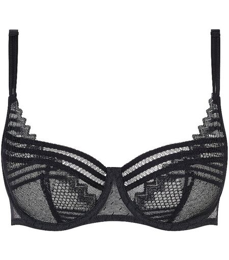 Damen BH aus besticktem Tüll Vorgeformte, unwattierte Cups Unterbrustbügel für einen formenden Halt Schließt mit zweireihigem Hakenverschluss am Rücken Verstellbare Träger Steg aus transparentem Mesh Geometrische Musterung mit Zacken-Kante Farbbezeichnung: Schwarz Material: 89% Polyamid, 11% Elasthan ...