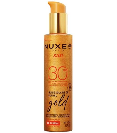 Anwendungsgebiet von Nuxe Sun Sonnenöl LSF 30Nuxe Sun Sonnenöl LSF 30 – Hoher Schutz mit schimmerndem FinishSchützen Sie Ihre Haut zuverlässig vor Sonnenstrahlen und verleihen Sie ihr gleichzeitig einen atemberaubenden goldenen Schimmer – mit unserem ersten Sonnenschutzöl mit Schimmereffekt⁽¹⁾.Dieses Gold-Sonnenöl mit LSF30 für Gesicht und Körper bietet einen umfassenden Breitspektrumschutz vor UVA- und UVB-Strahlen sowie Blaulicht. Dank eines innovativen, patentierten Filtersystems⁽²⁾ schützt das Nuxe Sun Sonnenöl LSF 30 doppelt so intensiv vor UVA-Strahlen und beugt so sonnenbedingter Hautalterung vor⁽³⁾. Die Formel ist wasserbeständig, nicht komedogen und für alle Hauttypen geeignet.Die Glow-Textur mit 100 % natürlichen Schimmerpartikeln spendet Feuchtigkeit, zieht schnell ein und hinterlässt kein fettiges Gefühl – für eine wunderschöne, veredelte Haut mit einem unwiderstehlichen irisierenden Gold-Finish.✔ 100 % der Anwenderinnen bestätigen: Die Haut wirkt perfektioniert, strahlt und ist intensiv mit Feuchtigkeit versorgt⁽⁴⁾.✔ 100 % der Anwenderinnen finden: Die Bräune hält besonders lange an⁽⁵⁾.Der sinnliche Duft aus süßer Orange, Tiaré-Blüten und Vanille verführt die Sinne – eine Einladung, den Sommer in vollen Zügen zu genießen.Wissenschaftlich bestätigte Wirksamkeit:Wirkstoffe / Inhaltsstoffe / ZutatenNuxe Sun Sonnenöl LSF 30 enthält:Coco-Caprylate/Caprate, C12-15 Alkyl Benzoate, Dibutyl Adipate, Diisopropyl Sebacate, Diethylamino Hydroxybenzoyl Hexyl Benzoate, Bis-Ethylhexyloxyphenol Methoxyphenyl Triazine, Ethylhexyl Triazone, Hydrogenated Castor Oil/Sebacic Acid Copolymer, Mica, Dextrin Myristate, Isopropyl Lauroyl Sarcosinate, Parfum/Fragrance, Ci 77891/Titanium Dioxide, Helianthus Annuus (Sunflower) Seed Oil, Ci 77491/Iron Oxides, Ethyl Ferulate, Rosmarinus Officinalis (Rosemary) Leaf Extract, Tocopherol, Tetramethyl Acetyloctahydronaphthalenes, Citrus Aurantium Peel Oil, Linalyl Acetat ...