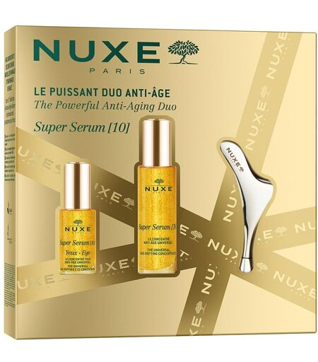 Anwendungsgebiet von Nuxe Geschenkset 2025 Super SerumVerschenken oder gönnen Sie sich selbst das Nuxe Geschenkset 2025 Super Serum – eine hochwirksame Pflegekombination für sichtbar glattere, strahlendere Haut. Ideal für alle Hauttypen und perfekt ergänzt durch ein exklusives Gesichtsmassagetool.Das Set enthält:Super Serum [10] (30 ml)Die universelle Anti-Aging-Essenz – glättet Falten, verfeinert das Hautbild, fördert die Strahlkraft.Super Serum [10] für die Augen (15 ml)Gezielte Pflege für die Augenpartie – mildert Fältchen, Schwellungen & Augenringe.GesichtsmassagetoolFördert die Mikrozirkulation und unterstützt die Aufnahme der Wirkstoffe.Wirkstoffe / Inhaltsstoffe / ZutatenNuxe Geschenkset 2025 Super Serum enthält:Super Serum [10] - Die Universelle Anti-Aging Essenz:Aqua/Water, Glycerin, Caprylic/Capric Triglyceride, Betaine, Propanediol, Niacinamide, Pentylene Glycol, 1,2-Hexanediol, Coco-Caprylate/Caprate, Castor Oil/Ipdi Copolymer, Leontopodium Alpinum Callus Culture Extract, Carbomer, Caprylyl Glycol, Parfum/Fragrance, Citric Acid, Sodium Hydroxide, Hyaluronic Acid, Trisodium Ethylenediamine Disuccinate, Sodium Hyaluronate, Passiflora Incarnata Extract, Alcaligenes Polysaccharides, Benzyl Alcohol, Xanthan Gum, Dehydroacetic Acid, Camphor, Carvone [N4601/B].Super Serum [10] - Die Universelle Anti-Aging Essenz Für Die Augenpartie:Aqua/Water, Glycerin, Caprylic/Capric Triglyceride, Betaine, Propanediol, Niacinamide, Pentylene Glycol, Limnanthes Alba (Meadowfoam) Seed Oil, Coco-Caprylate/Caprate, Benzyl Alcohol, Castor Oil/Ipdi Copolymer, Leontopodium Alpinum Callus Culture Extract, Parfum/Fragrance, Acrylates/C10-30 Alkyl Acrylate Crosspolymer, Caprylyl Glycol, Caffeine, Hyaluronic Acid, Sodium Hydroxide, Trisodium Ethylenediamine Disuccinate, Sodium Hyaluronate, Passiflora Incarnata Extract, Citric Acid, Xanthan Gum, Dehydroacetic Acid, Acetyl Tetrapeptide-5, Tocopherol, Camphor, Carvone [N4602/C].GegenanzeigenBei bekannter Überempfindlic ...