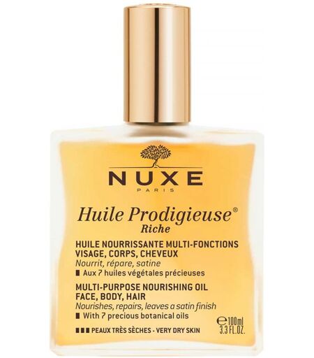 Die Haut wird intensiv genährt, sodass sie sich angenehmer und weicher anfühlt. Außerdem sorgt dieses feuchtigkeitsspendende, nährende Öl für glänzendes, geschmeidiges Haar.Wirkungsweise von Nuxe Huile Prodigieuse Riche reichhaltiges KörperölNuxe Huile Prodigieuse Riche reichhaltiges Körperöl nährt und repariert Haut und Haar und macht geschmeidig, die Trockenöltextur zieht schnell ein und der sinnliche Duft machen das Öl so einzigartig.