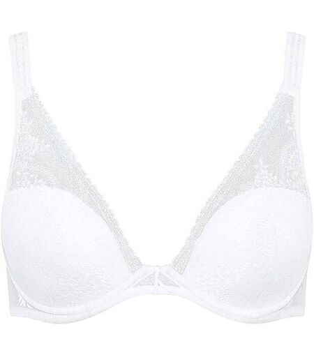 Damen T-Shirt BH mit tiefem Ausschnitt Cups mit flacher Spitze überzogen Auf Steg gearbeitet Miederrücken und Mittelsteg unterlegt mit fantasievollem, gestreiften Tüll Verschluss mit 3 Reihen Schleifchen vorne Oekotex zertifiziert Farbbezeichnung: Weiss Material: Spitze: 78% Polyamid, 22% Elasthan Spitze Rücken 86% Polyamid, 14% Elasthan ...