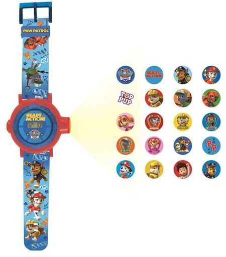 """20 Paw Patrol Bilder zum Projizieren. Produkt im Paw Patrol Design. Kommuniziere mit deinen Freunden, indem du kodierte Nachrichten mit deinen projizierten Bildern schickst. Anpassbares Armband, das auch auf schmale Handgelenken passt. Beweglicher Ring zum Projizieren von Bildern. Anzeige von Datum und Uhrzeit. Stromversorgung über 5x AG3/LR41 -Batterien (mitgeliefert). 2 Jahre Garantie.""" ...