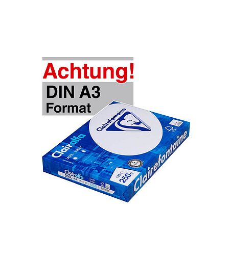 Mit dem Clairefontaine Kopierpapier Clairalfa DIN A3 250 g/qm 125 Blatt erhalten Sie Qualität, die sich sehen lassen kannDie ersten Informationen zum Clairefontaine Kopierpapier Clairalfa DIN A3 250 g/qm 125 Blatt erhalten Sie hier: DIN A3250 g/qmEU-Blume, FSC®-zertifiziertDuplex-Druck und -KopieBedruckbar mit Laser, InkJetGeeignet für Kopierer, DruckerFür interessante Produktinformationen einfach weiterlesen!Damit alles passt: Format und FarbeDas Clairefontaine Kopierpapier Clairalfa DIN A3 250 g/qm 125 Blatt ist perfekt für jeden Tag geeignet, denn für die meisten Ausdrucke im Arbeitsalltag eignet sich ein Hintergrund in Hochweiß optimal. Darf es zudem DIN A3 sein? Perfekt! Auch größere Aufgaben stellen somit kein Problem dar.PapiergewichtDas Produkt kann als Karton eingruppiert werden. Dies hängt mit dem Papiergewicht von 250 g/qm zusammen, welches eine ungefähre Abschätzung zur Stabilität und Dicke geben kann.Mit diesen Besonderheiten punktet der ArtikelDiese besonderen Eigenschaften stecken in dem Artikel: • Das Referenzpapier für alle Büroanwendungen • Multifunktionspapier (Inkjet- und Laserdruck) • Die einzigartige Lösung für alle Drucksysteme • Hochweiss (171 CIE) • Satinierte Oberfläche • Garantiert einwandfreie Laufeigenschaften • FSC und mit dem europäischen Ecolabel zertifiziert • Sehr breites GrammaturspektrumDie Laufrichtung – wichtig für die WeiterverarbeitungMöchten Sie die Seiten beispielsweise zu Prospekten weiterverarbeiten, ist die Laufrichtung, hier Breitbahn, interessant. Die Seiten zu falten funktioniert in Laufrichtung deutlich einfacher.Hier finden Sie die Verwendungsmöglichkeiten des ArtikelsDie passenden Geräte zu diesem Produkt sind Kopierer, Drucker, im Speziellen Laser, InkJet-Geräte. Das Clairefontaine Kopierpapier Clairalfa DIN A3 250 g/qm 125 Blatt hat eine Opazität von 99 %. D.h., dass das Verbrauchsmaterial nahezu blickdicht und insofern für das Drucken und Kopieren im Duplexverfahren geeignet ist.Wenn mal etwas länger archiviert werden soll...Mit diesem Produkt haben Sie die besten Voraussetzungen zum Archivieren Ihrer Unterlagen, Akten und Dokumente. Das Clairefontaine Kopierpapier Clairalfa DIN A3 250 g/qm 125 Blatt hat nach DIN 9706 eine Alterungsbeständigkeit von bis zu 200 Jahren.Diese Umweltaspekte wurden bei der Herstellung berücksichtigtDieses Produkt besitzt aufgrund seines vorbildlichen Herstellungsprozesses, bei dem auf einen verantwortungsvollen Umgang mit Ressourcen geachtet wurde, folgende Zertifikate: FSC®: Die verwendeten Materialien stammen aus FSC®-zertifizierten Wäldern und anderen kontrollierten Quellen.EU-Blume: Konsumgüter, die sich durch besondere Umweltverträglichkeit und vergleichsweise geringe Gesundheitsbelastung auszeichnen.Entspricht dieses Produkt Ihren Anforderungen?Dann haben wir gute Nachrichten: Sie können ganz einfach in unserem Online-Shop bestellen! Sie erhalten 1 Pack = 125 Blatt des Clairefontaine Kopierpapiers Clairalfa. ...