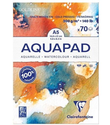 Quo Vadis Aquarellblock Goldline Aquapad A5 geleimt, 70 Blatt weiß 300g, mittlere Körnung