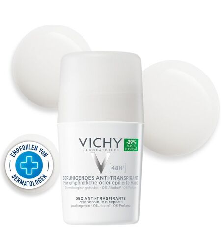 VICHY Deodorant Sensitiv Anti-Transpirant 48h Roll-on Deodorant für sehr empfindliche oder epilierte Haut Reguliert die Transpiration bis zu 48hSchutz gegen übermäßige Schweißbildung Wirksam bei starker Hitze sowie bei sportlicher Betätigung Dermatologisch getestet Der DEODORANT SENSITIV ANTI-TRANSPIRANT 48H ROLL-ON von Vichy ist optimal für sehr empfindliche oder epilierte Haut geeignet. Das Anti-Transpirant bietet eine langanhaltende Wirkung gegen starkes Schwitzen und sorgt für ein angenehmes Hautgefühl. Das Thermalwasser von Vichy stärkt und beruhigt sensible sowie gereizte Haut. Das Deo bietet somit einen effektiven Schutz bei starker Hitze oder sportlicher Betätigung. Das Anit-Transpirant wurde dermatologisch getestet. Hauttyp: Empfindliche Haut. Anwendung: Tragen Sie das DEODORANT SENSITIV ANTI-TRANSPIRANT 48H ROLL-ON von Vichy täglich in der sauberen und trockenen Achselhöhle auf. Verwenden Sie das Anti-Transpirant bei starker sportlicher Belastung oder starkem Schwitzen mehrmals täglich. Zusammensetzung: AQUA / WATER • ALUMINUM CHLOROHYDRATE • PPG-15 STEARYL ETHER • CETEARYL ALCOHOL • CETEARETH-33 • DIMETHICONE • IODOPROPYNYL BUTYLCARBAMATE • NYMPHAEA ALBA EXTRACT / NYMPHAEA ALBA FLOWER EXTRACT • SODIUM PALMITOYL PROLINE Hersteller: TSA 75000 93584 ST OUEN CEDEX FR. France fragen@loreal-group.com ...