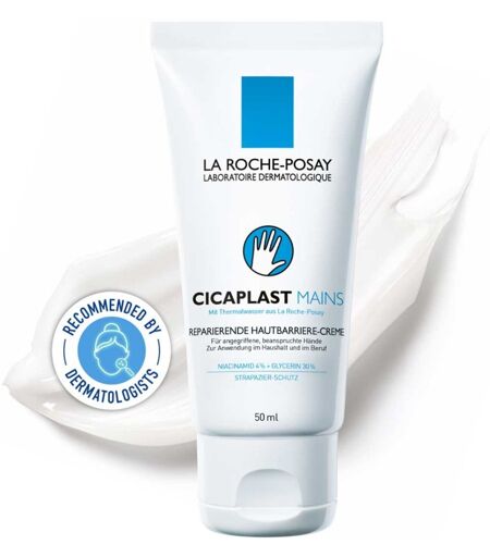 Anwendungsgebiet von La Roche Posay Cicaplast Hände Regenerierende CremeLa Roche Posay Cicaplast Hände Regenerierende Creme ist ideal für rissige und strapazierte Hände geeignet. Sie bietet angenehmen Schutz und Pflege und mildert Hautirritationen und Rötungen bei Trockenheit der Haut. Besonders angenehm ist das sofortige Einziehen nach dem Auftragen. Die Hautcreme enthält beruhigendes Thermalwasser und Karitébutter. Dadurch werden Spannungsgefühle reduziert und die Haut wird vor Feuchtigkeitsverlust geschützt. Weiterer Schutz wird durch eine Glycerin-Formel gewährleistet. Diese bildet sofort eine schützende Barriere auf der Haut und verhindert nachhaltig das Austrocknen besonders empfindlicher Stellen, wie zum Beispiel den Fingerkuppen oder -knöcheln. Diese Funktion wird durch den Inhaltsstoff Niacinamid unterstützt, der vor allem die Beschwerden von geröteten und irritierten Händen mildert. Trotz all dieser Eigenschaften zieht die reparierende Hautbarriere-Creme schnell ein und hinterlässt keine Rückstände.