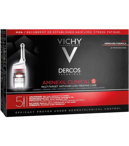 Vichy Aminexil Clinical 5 Pflegebehandlung bei permanentem oder periodischem Haarausfall.Geeignet für empfindliche KopfhautEnthält patentierte Wirkstoffkombination aus Aminexil®, SP94™ und ArgininHochpräziser ApplikatorDERCOS AMINEXIL Clinical 5 für MännerWirksamkeit klinisch bewiesen unter dermatologischer Kontrolle. Unterstützt das natürliche Haarwachstum. Das Haar wird dichter und widerstandsfähiger.Intensive Pflegebehandlung bei permanentem oder periodischem Haarausfall*.Enthält die patentierte Wirkstoffkombination aus Aminexil®, SP94™ und Arginin, um die Haarwurzel zu verankern, die Haarfaser zu kräftigen und zu festigen und die Mikrozirkulation zu stimulieren.*Nicht krankheitsbedingter Haarausfall.Hauttyp:Alle Hauttypen.Als Standardanwendung:3 Ampullen/Woche - 6 Wochen lang.Als Intensivkur:1 Ampulle/Tag, 6 Wochen lang. Im trockenen oder feuchten Haar verteilen.Nur zur äußerlichen Anwendung. Nicht einnehmen. Gereizte Haut oder Augen vermeiden. Bei Kontakt mit den Augen sofort gründlich ausspülen.Zusammensetzung:AQUA / WATER • ALCOHOL DENAT. • DIAMINOPYRIMIDINE OXIDE • ACRYLATES/BEHENETH-25 METHACRYLATE COPOLYMER • AMINOMETHYL PROPANOL • ARGININE • BHT • CAFFEINE • LACTIC ACID • PEG-40 HYDROGENATED CASTOR OIL • PIROCTONE OLAMINE • SAFFLOWER GLUCOSIDE • SODIUM CITRATE • TOCOPHEROL • PARFUM / FRAGRANCEHersteller: TSA 75000 93584 ST OUEN CEDEX FR. France fragen@loreal-group.com ...