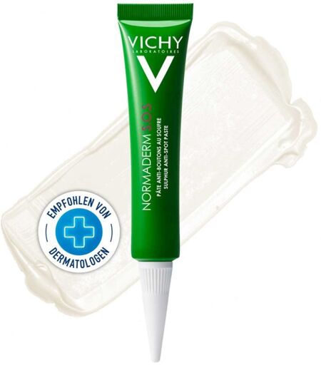 Anwendungsgebiet von Vichy Normaderm Anti-pickel Sulfur PasteDie Vichy Normaderm Anti-pickel Sulfur Paste ist eine Anti-Pickel-Creme für zu Akne neigende Haut. Die Anti-Pickel Paste trocknet dank 10% Sulfur einzelne Pickel schnell und gezielt aus. Dazu mildert sie die Neuentstehung von Unreinheiten und beruhigt Rötungen. Die S.O.S Pickel-Hilfe ist auch für empfindliche Haut geeignet.