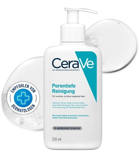 Anwendungsgebiet von CeraVe Porentiefe ReinigungDie CeraVe Porentiefe Reinigung für das Gesicht ist ein milder Reinigungsschaum mit Salicylsäure, der unreine Haut intensiv reinigt. Er verfeinert das Hautbild und entfernt überschüssigen Talg.