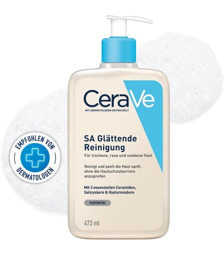 Das gemeinsam mit Dermatologen entwickelte CeraVe SA Glättende Reinigung für trockene Haut enthält glättende Salicylsäure, hydratisierendes Hyaluron und Urea sowie drei essenzielle Ceramide zur Aufrechterhaltung der Hautschutzbarriere. Dank der sanften, hautglättenden Formel wird die Haut und Hautschutzbarriere durch den Peeling-Effekt nicht gereizt.
