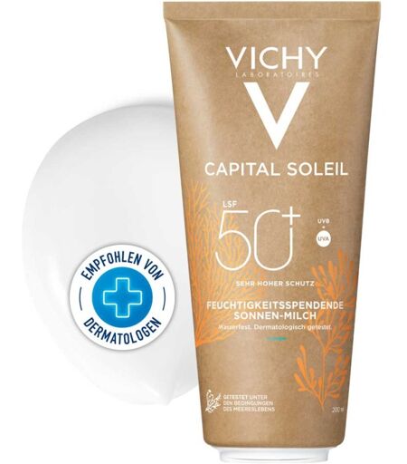 Anwendungsgebiet von Vichy Capital Soleil Feuchtigkeitsspendende Sonnen-Milch LSF50+Die Vichy Capital Soleil Feuchtigkeitsspendende Sonnen-Milch LSF50+ versorgt die Haut dank Hyaluron 24 Stunden mit Feuchtigkeit und schützt sie so vor dem Austrocknen durch Salz, Chlor und Wind. Verpackt ist sie in einer nachhaltigen Karton-Tube.
