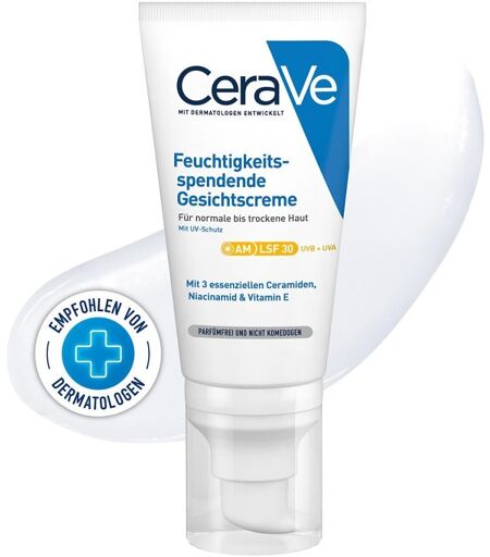 Anwendungsgebiet von CeraVe Feuchtigkeitsspendende Gesichtscreme mit LSF 30Die CeraVe Feuchtigkeitsspendende Gesichtscreme mit LSF 30 mit LSF 30 spendet normaler bis trockener Haut bis zu 24 Stunden Feuchtigkeit, stärkt die Hautschutzbarriere und schützt vor UVA- und UVB-Strahlung.