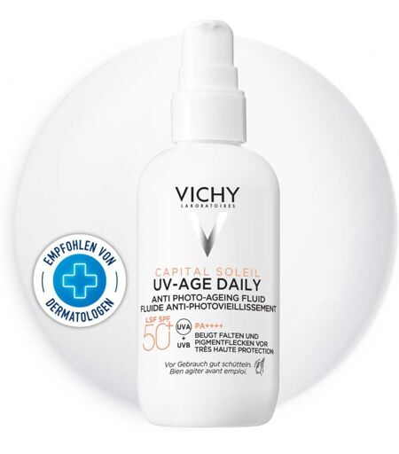 Anwendungsgebiet von Vichy Capital Soleil Uv-Age Daily Lsf 50+Die Vichy Capital Soleil Uv-Age Daily Lsf 50+ kommt jetzt für den täglichen Sonnenschutz in der Vorteilsgröße von 80 ml. Mit ihrer fortschrittlichen Netlock-Technologie bildet die Sonnenpflege einen unsichtbaren Schutzfilm auf deiner Haut, der Gesicht, Hals, Dekolleté und Hände zuverlässig vor der Sonne schützt. Gleichzeitig sorgen Anti-Aging-Wirkstoffe wie Niacinamid für einen Schutz vor allen Anzeichen der Hautalterung. Die ultra-leichte Textur bildet ein unsichtbares Finish. Das macht das Sonnenspray zum idealen Partner für den täglichen Gebrauch. Auch Layering und das anschließende Auftragen von Make-up sind mit Vichy Capital Soleil Uv-Age Daily Lsf 50+ problemlos möglich.Wirkstoffe / Inhaltsstoffe / ZutatenVichy Capital Soleil Uv-Age Daily Lsf 50+ enthält:Aqua / Water / Eau • Alcohol Denat. • Diisopropyl Sebacate • Silica • Isopropyl Myristate • Ethylhexyl Salicylate • Ethylhexyl Triazone • Bis-Ethylhexyloxyphenol Methoxyphenyl Triazine • Butyl Methoxydibenzoylmethane • Glycerin • C12-22 Alkyl Acrylate/Hydroxyethylacrylate Copolymer • Propanediol • Niacinamide • Drometrizole Trisiloxane • Perlite • Tocopherol • Caprylic/Capric Triglyceride • Acrylates/C10-30 Alkyl Acrylate Crosspolymer • Caprylyl Glycol • Hydrolyzed Rice Protein • Hydroxyethylcellulose • Pentylene Glycol • Terephthalylidene Dicamphor Sulfonic Acid • Triethanolamine • Trisodium Ethylenediamine Disuccinate • Vitreoscilla Ferment • Parfum / FragranceGegenanzeigenBei bekannter Überempfindlichkeit gegenüber einen der oben genannten Inhaltsstoffe sollte dieses Produkt nicht angewendet werden.HinweiseSicherheitshinweis:Intensive Mittagssonne vermeiden. Vor dem Sonnen auftragen. Mehrfach auftragen, um den Lichtschutz aufrechtzuerhalten, insbesondere beim Schwitzen oder nach dem Schwimmen und Abtrocknen. Sonnenschutzmittel großzügig auftragen. Geringe Auftrags ...