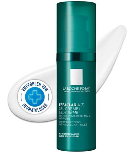 Anwendungsgebiet von La Roche Posay Effaclar A.Z. Gel-CremeDie La Roche Posay Effaclar A.Z. Gel-Creme ist eine speziell entwickelte Anti-Akne- und Anti-Age-Pflege, die sich ideal für erwachsene Haut mit Unreinheiten eignet. Ihre leichte Gel-Textur zieht schnell ein und ist besonders gut verträglich – auch bei sensibler oder fettiger Haut. Das Produkt ist optimal für alle, die unter hartnäckigen Pickeln, Mitessern oder Pickelmalen leiden, aber gleichzeitig die ersten Anzeichen von Hautalterung wie feine Linien und Fältchen bekämpfen möchten. Innerhalb von nur sieben Tagen lassen sich sichtbare Verbesserungen bei Unreinheiten und dem allgemeinen Hautbild feststellen – für eine reinere, glattere und jünger aussehende Haut.Wirkungsweise von La Roche Posay Effaclar A.Z. Gel-CremeDie La Roche Posay Effaclar A.Z. Gel-Creme vereint dermatologisch bewährte Wirkstoffe, die synergetisch gegen Akne und Altersanzeichen wirken:Azelainsäure bekämpft nicht nur Pickel und Pickelmale, sondern sorgt durch ihre sanfte Peeling-Wirkung für eine Verbesserung bei Pigmentflecken und sorgt so für ein ebenmäßigeres Hautbild.Salicylsäure (BHA) unterstützt die Zellerneuerung, wirkt porenverfeinernd und reduziert Unreinheiten und verstopfte Poren, indem sie tief in die Haut eindringt und überschüssigen Talg löst.Hyaluronsäure spendet intensiv Feuchtigkeit, polstert die Haut auf und hilft dabei, feine Linien und Fältchen zu mildern, ohne zu beschweren.Ergänzt wird die Formel durch beruhigendes Thermalwasser von La Roche-Posay, das die Haut zusätzlich pflegt und Reizungen lindert.Wirkstoffe / Inhaltsstoffe / ZutatenLa Roche Posay Effaclar A.Z. Gel-Creme enthält: