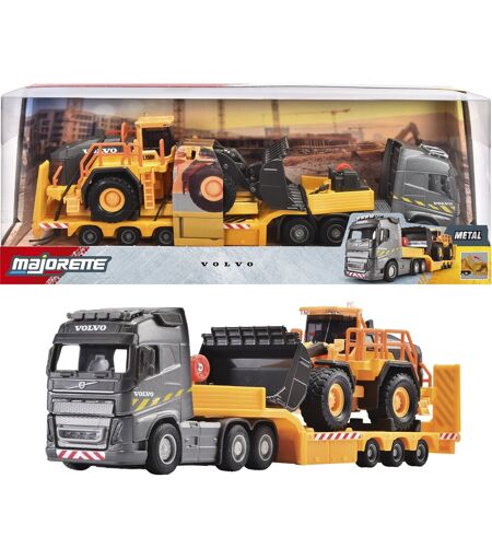Im großen Maßstab der Modellautos aus der Majorette Grand Series und offiziell lizenziert von Volvo ist der 35 cm lange Truck mit Radlader ein kraftgeladenes Autospielzeug für kleine Bauarbeiter. Klappe die Rampe des Trucks herunter und manövriere mithilfe von Schleppwinde, Schnur und Haken den Radlader und andere Autos auf die Ladefläche. Oder hebe und verlade mit der beweglichen Bagger-Schaufel Baumaterial von A nach B. So erlebst du immer wieder neue Bau-Abenteuer und fantasievolle Transport- und Ladeaktionen! Dank Weichgummireifen mit Profil, Freilauf und robuster Metall-Teile bist du mit diesem 2-in-1-Spielset auf alles vorbereitet. Neugierige Technikfans öffnen Klappen und entdecken kraftvolle Motoren, kleine Bauprofis transportieren ihre Ladung unermüdlich ins Ziel. Ein tolles Spielfahrzeug-Duo für Kinder ab 3 Jahren! ...