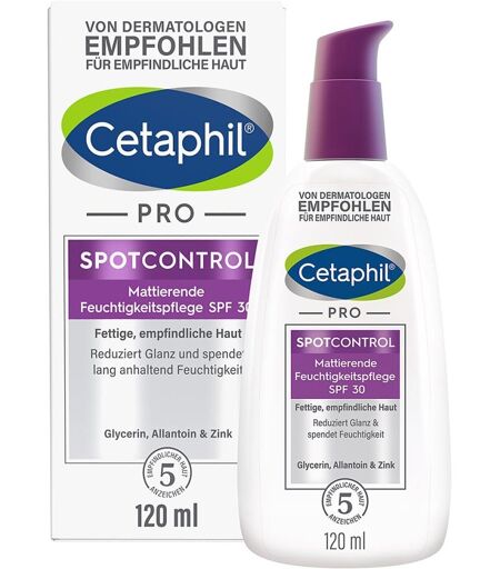 Cetaphil PRO SpotControl Mattierende Feuchtigkeitspflege SPF 30 wurde speziell für die Bedürfnisse fettiger und unreiner Haut entwickelt. Die leichte 3-in-1 Feuchtigkeitspflege reduziert Glanz und Hautunreinheiten, spendet langanhaltend Feuchtigkeit und schützt dank hohem Lichtschutzfaktor vor UVA- und UVB-Strahlen. Für ein gepflegtes und ebenmäßiges Hautbild. Die Feuchtigkeitspflege ist auch zur begleitenden Pflege während der Akne-Therapie geeignet.1) Dermatologische und hautphysiologische Untersuchungen bestätigen die sehr gute Verträglichkeit bei zu Akne und Unreinheiten neigender Haut. Nicht komedogen. Ohne Duftstoffe.