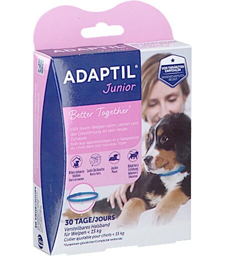 Adaptil Junior Halsband für Hundewelpen wurde entwickelt, um Welpen vom ersten Tag im neuen Zuhause bis zum Ende der Sozialisationsphase Sicherheit und Geborgenheit zu geben. Dadurch wird die Eingewöhnung erleichtert, und der Welpe kann entspannt lernen und sich zu einem ausgeglichenen Familienmitglied entwickeln. Das Halsband wird ab der Adoption bis zum Alter von 6 Monaten empfohlen. Es sollte ohne Unterbrechung vom Welpen getragen werden. Nach jeweils 1 Monat sollte es durch ein neues Halsband ersetzt werden.