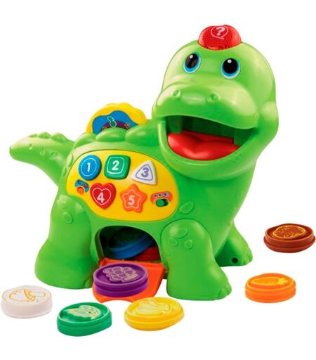 Der Fütter-mich Dino beinhaltet viele verschiedene Tasten und Funktionen, wodurch Kinder Farben, Formen, Zahlen und Obst/Gemüse spielerisch kennenlernen. Der Fütter-mich Dino spielt elf gesungene Lieder und Sätze sowie 20 Kindermelodien ab, die das Hörverständnis des Kindes fördern. Wird der Dino mit den bunten Futterchips gefüttert, erkennt und benennt er sie, bevor sie in seinem Bauch verschwinden, wo sie praktisch aufbewahrt werden können. ...