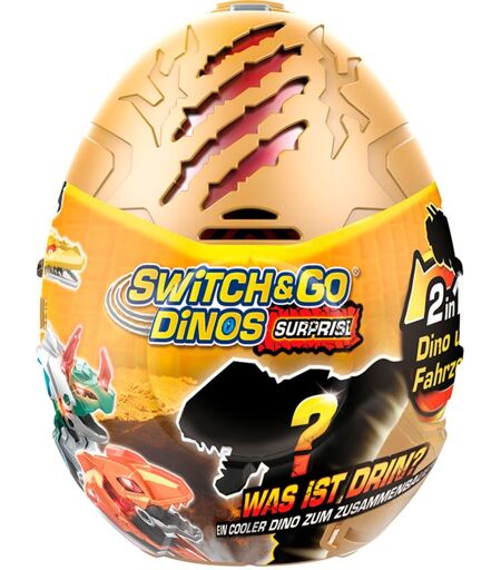 Überraschung! Welcher mächtige Dino wohl aus dem Ei schlüpft? Ein Surprise-Ei enthält jeweils einen von vier verschiedenen Dinos (Ausführung nicht wählbar), die jeweils in zwei Farbvarianten erhältlich sind (T-Rex in Blau oder Gold, Velociraptor in Blau oder Orange, Triceratops in Grün oder Rot, Pterodaktylus in Grün oder Gelb). Für tollen Spielspaß sorgt der Inhalt eines Eis: Die über 13 im Bausatz enthaltenen Bauteile können zu einem mächtigen Dino zusammengebaut werden, der anschließend mit nur wenigen Hand- griffen in ein cooles Fahrzeug verwandelt werden kann. Das Fahrzeug unterscheidet sich je nach Dino-Variante (Rennauto, Rennwagen (Einsitzer), Sportwagen, Helikopter). Beim Drücken der Kopftaste werden realistische Sätze und Geräusche abgespielt, die roten LED-Augen der Dinos leuchten. ...