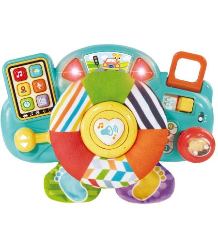 Mit Babys Lernlenkrad von Vtech übernehmen die Minis das Steuer. Das interaktive Spielzeug bietet ihnen zahlreiche Entdeckungsmöglichkeiten sowie Licht- und Sound-Effekte. Babys Lernlenkrad von Vtech verschiedene Oberflächen und Texturen, Tasten und beweglichen Elemente kindersicheres Batteriefach, Abschaltautomatik und Lautstärkeregler Licht- und Sound-Effekte (Geräusche, Sätze, 4 gesungene Lieder und 10 Melodien) deutschsprachig aus Kunststoff und Textil ab 6 Monaten geeignet Mit Babys Lernlenkrad von Vtech kommt keine Langeweile auf. Kinder ab sechs Monaten haben jede Menge Spaß daran, die verschiedenen Oberflächen und Texturen des Spielzeugs zu erkunden. Sobald sie das Stofflenkrad drehen, spielt es Geräusche und Sätze ab. Auch der bewegliche Blinker und der Schieberegler der Klimaanlage lösen verschiedene Sounds und Melodien aus. Die Minis können hupen, den Spiegel oder die leuchtenden Blinklichter erkunden. Das Spielzeughandy hält sechs Tasten, die sich den Themen Musik, Navigation, Uhr, Wetter, Radio und Kalender widmen, bereit. Die Fußpedale überraschen die Minis mit Knisterfolie, der Geschwindigkeitsmesser enthält Rasselperlen. Damit die Kids auch unterwegs beschäftigt sind, kann das Lernlenkrad am Kindersitz oder Buggy befestigt werden. Die Lautstärke lässt sich individuell regulieren. Eine Abschaltautomatik stellt sicher, dass der Energieverbrauch so gering wie möglich ausfällt. ...
