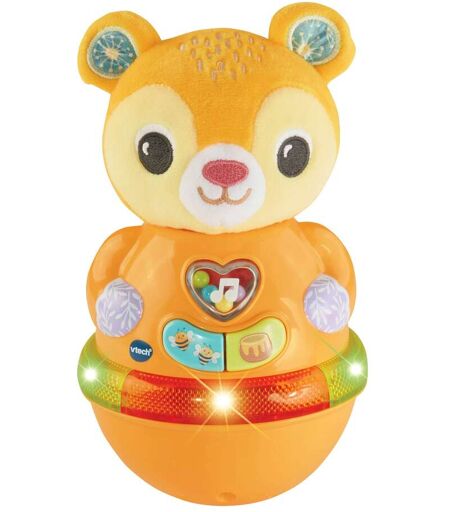 Das Wackelbärchen von Vtech bietet den Minis fröhlichen Lern- und Spielspaß. Die Kleinen können mit dem Teddy ihre Hand-Auge-Koordination trainieren und zahlreichen Sounds lauschen. Wackelbärchen von Vtech inkl. Demo-Batterien (2 x AAA (Micro)) kindersicheres Batteriefach, verschiedene Oberflächen Leuchtring, verschiedene Sound-Effekte (3 Lieder, 12 Melodien, Geräusche und Sätze), Bewegungssensor, Lautstärkeregler, Abschaltautomatik Sprache: Deutsch aus robustem Kunststoff und Textil ab 6 Monaten geeignet Das Wackelbärchen von Vtech bringt tierischen Spaß ins Kinderzimmer: Die Minis können das Spielzeug durch einfaches Anschubsen in Bewegung versetzen. Wie ein Stehaufmännchen bringt sich der kleine Teddy immer wieder in eine aufrechte Position. Ein Bewegungssensor registriert das Schaukeln des Spielzeugs und löst Sound-Effekte aus. Auch über die drei Tasten am Bauch des Tiers können die Kleinen Sätze, Geräusche oder Lieder aktivieren. Die Herztaste sorgt mit bunten Rasselperlen für Extraspaß. Die Bienen- und Honigtaste lösen thematisch passende Reaktionen aus. Die Kids können mit dem Teddy verschiedene Oberflächen ertasten und ihre Motorik trainieren. Für ausdauernden Spaß zieht der in verschiedenen Farben erstrahlende Leuchtring die Aufmerksamkeit immer wieder aufs Neue auf sich. Praktisch: Die Lautstärke der Sound-Effekte kann individuell reguliert werden. Um die Batterien zu schonen, verfügt das Spielzeug über eine Abschaltautomatik. ...